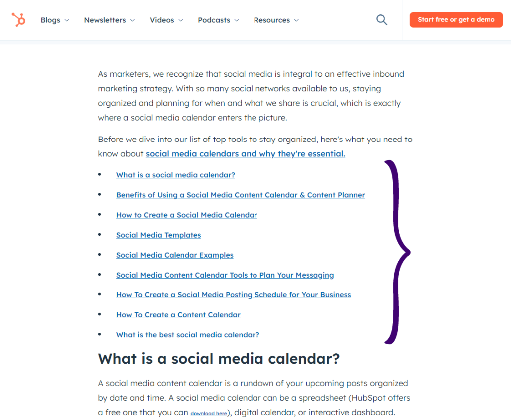 Again, HubSpot uses these to great effect, for example in their blog post about social media calendar tools – shown above/to the right next to the purple bracket (my addition for clarity).